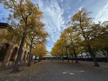 Wir wünschen Euch und allen Familien schöne, erholsame Herbstferien! Die Schule beginnt wieder am Montag 03.11.2025 nach Stundenplan. Das Team der Gutenbergschule Karlsruhe Foto: Herbsttag auf dem Schulhof (T. Friedrich, 08.10.2025)